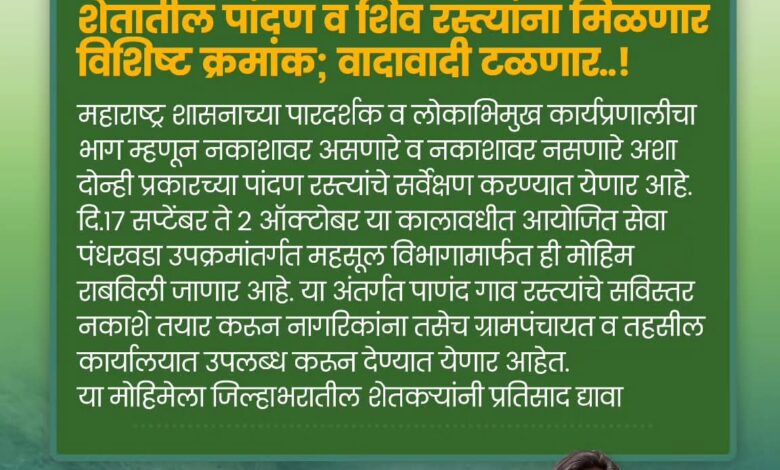 महाराष्ट्र शासनाच्या पारदर्शक व लोकाभिमुख कार्यप्रणालीचा भाग म्हणून नक्शावर असणारे व नक्शावर नसणारे अशा दोन्ही प्रकारच्या पांदण व गाव रस्त्यांचे सर्वेक्षण करण्यात येणार आहे. दि. 17 सप्टेंबर ते 2 ऑक्टोबर या कालावधीत आयोजित सेवा पंधरवड्याच्या उपक्रमांतर्गत महसूल विभागामार्फत ही मोहीम राबविण्यात येणार आहे.