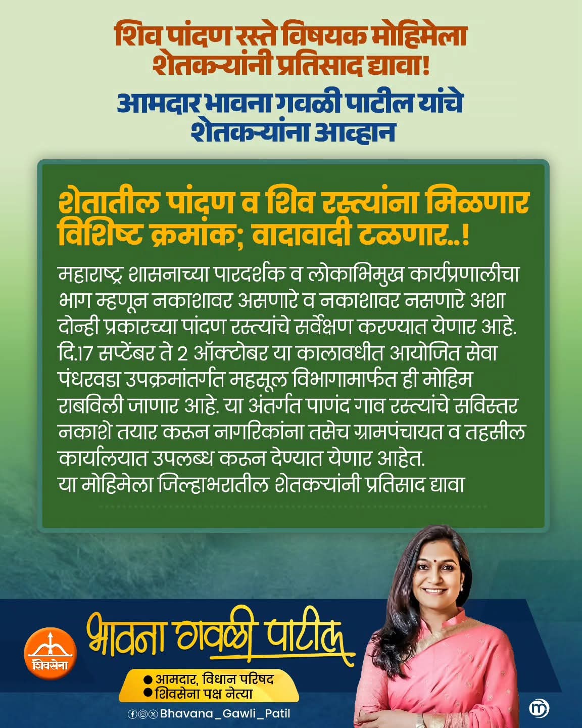 शिव पांदण रस्ते विषयक मोहिमेला शेतकऱ्यांचा प्रतिसाद घ्यावा – आमदार भावना गवळी पाटील यांचे आवाहन.